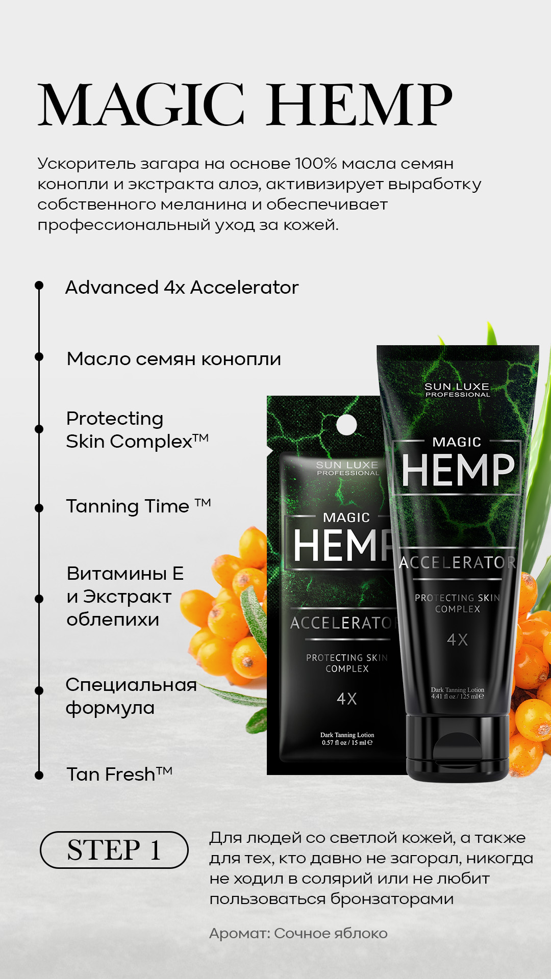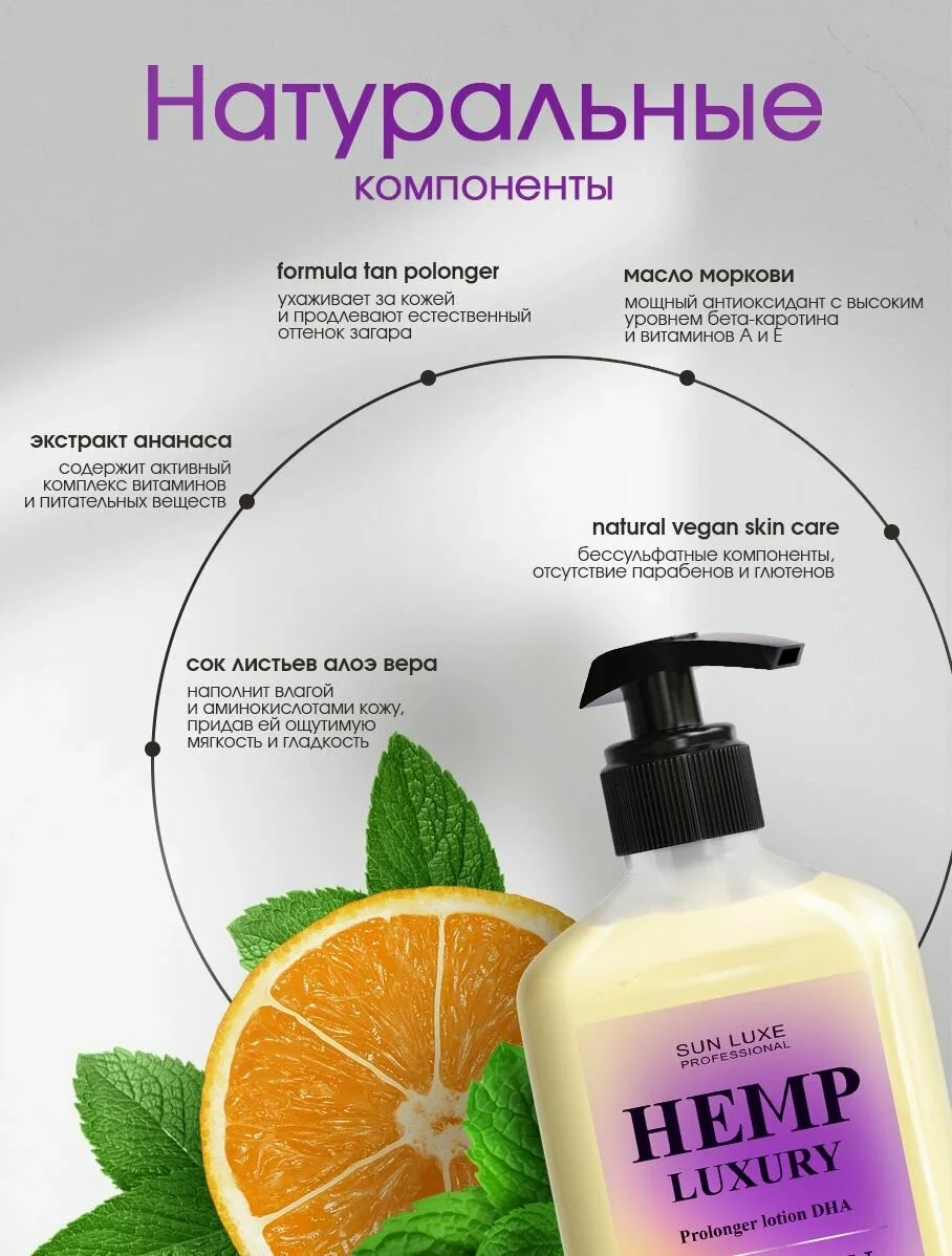 Hemp Luxury Self Tan - профессиональный питательный лосьон после загара для лица и тела.Лёгкая формула этого парфюмированного крема для тела с комплексом пролонгированного действия в сочетании с DHA создана для ухода после загара в солярии, на солнце или в любое время, когда вашей коже требуется прохладный глоток свежести. Молочко для тела имеет успокаивающее действие с охлаждающим эффектом и способствует восстановлению после активного пребывания на солнце. Уникальный комплекс Tan Prolonger – помогает сохранить кожу увлажненной и здоровой, а также гарантирует постепенное, равномерное потемнение, придавая коже мягкий и красивый оттенок загара.