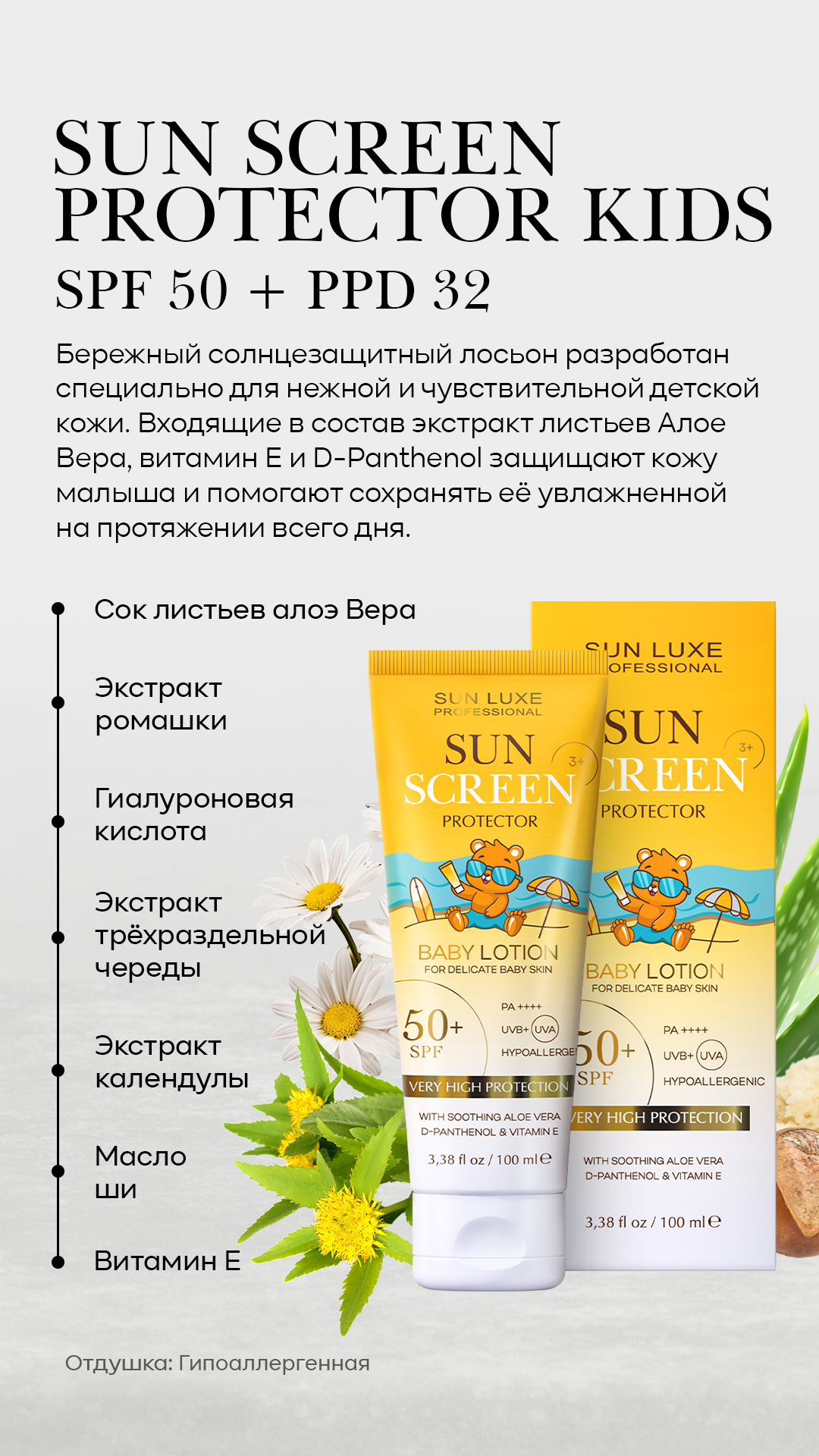 Sun Screen SPF 50 + PPD 32 — это надежная защита от солнца и нежный уход за вашей кожей, который подарит ощущение освежающей роскоши.